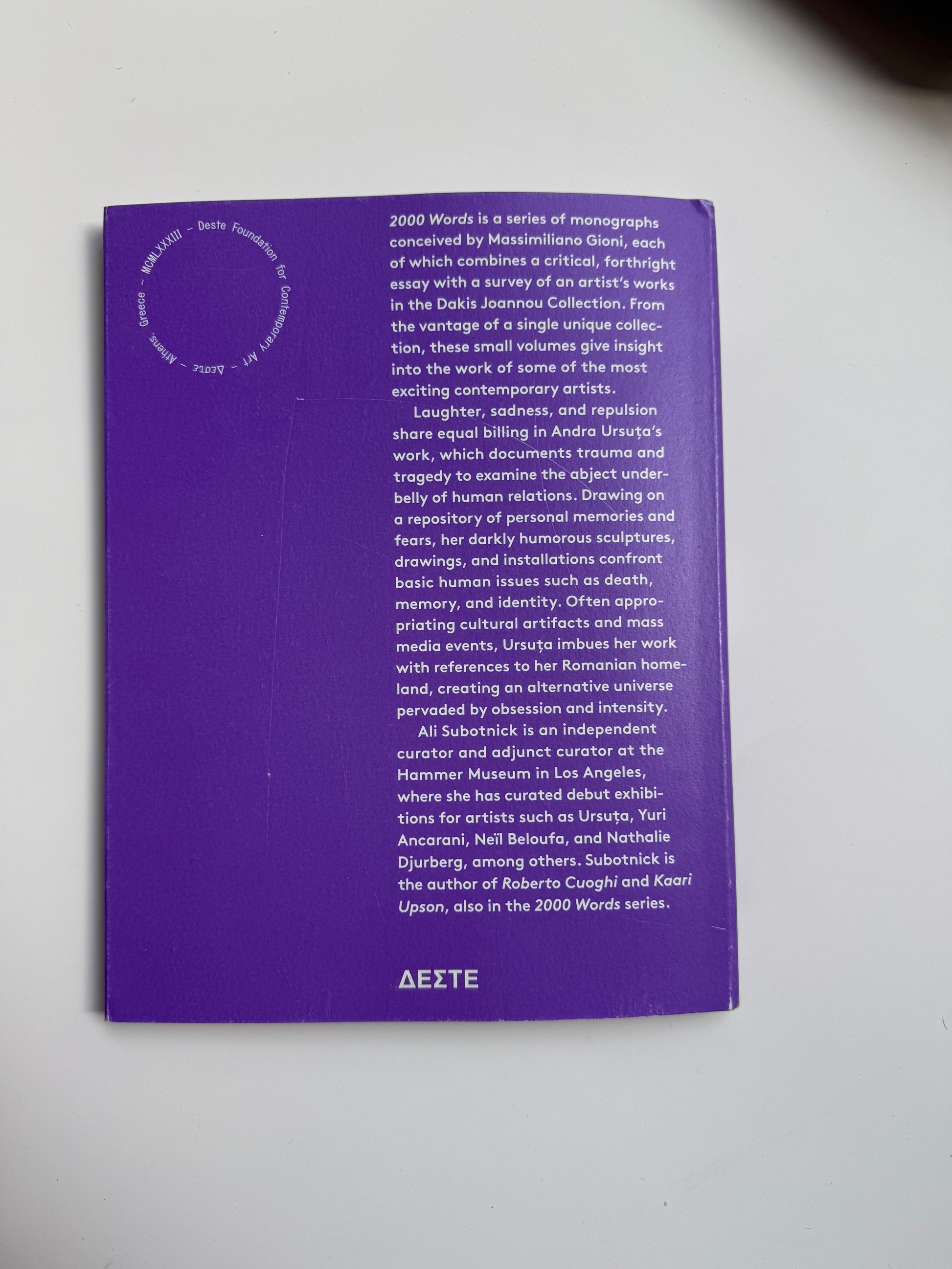 Part of the 2000 Words series, conceived and commissioned by Massimiliano Gioni and published by the DESTE Foundation for Contemporary Art, 2000 Words: Andra Ursuţa includes an essay by Ali Subotnick that examines Ursuţa’s stark re-creations of cultural and historical turmoil.