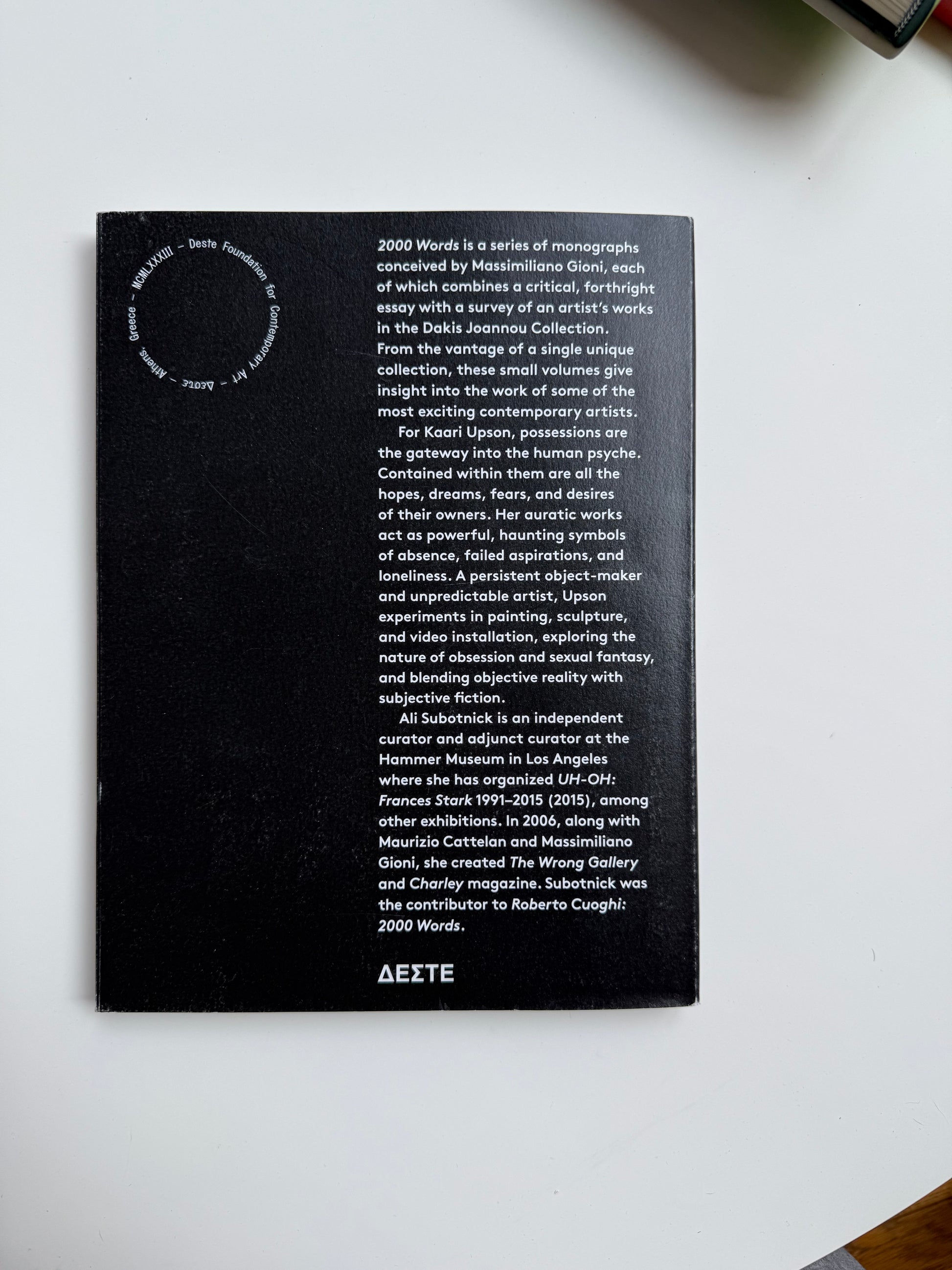 Part of the 2000 Words series conceived by Massimiliano Gioni and published by DESTE Foundation for Contemporary Art, this monograph contains an essay by Ali Subotnick that examines Upson’s pseudo-scientific approach to her art that allows her to create confounding work that is simultaneously familiar and foreign.